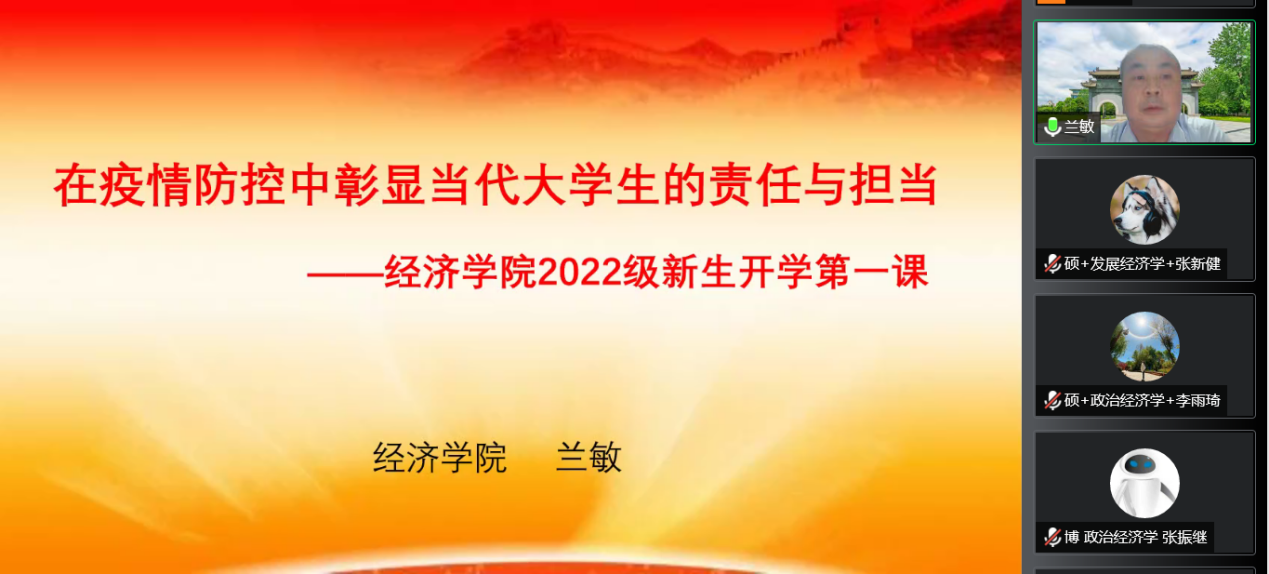 兰敏从抗疫精神的精神内涵、抗疫精神彰显我国社会主义制度的制度优势、当前疫情防控的政策和要求、在疫情防控中彰显当代大学生的责任与担当四个方面给同学们进行了分享。面对当前复杂严峻的疫情防控形势,同学们要严格遵守疫情防控各项管理要求,做好健康监测、加强个人防护、做好应急管理。同时,结合疫情防控工作,给同学们提出三点希望和要求:一是敬畏规则,严守纪律。要严格遵守学校关于疫情防控的相关规定,担当起个人健康第一责任人的职责,识大体、顾大局。做好自我防护,坚决服从学校的防控管理和安排。二是不信谣、不传谣。要多注意自己的网络言行,防控政策和要求以官方的通知通告为准。三是积极参与疫情防控工作。作为新时代的西财青年,在疫情面前要肩负起使命与担当,做好自身防护的同时,积极参与到班级、学院、学校的疫情防控工作中,做老师的小帮手、疫情防控的志愿者。