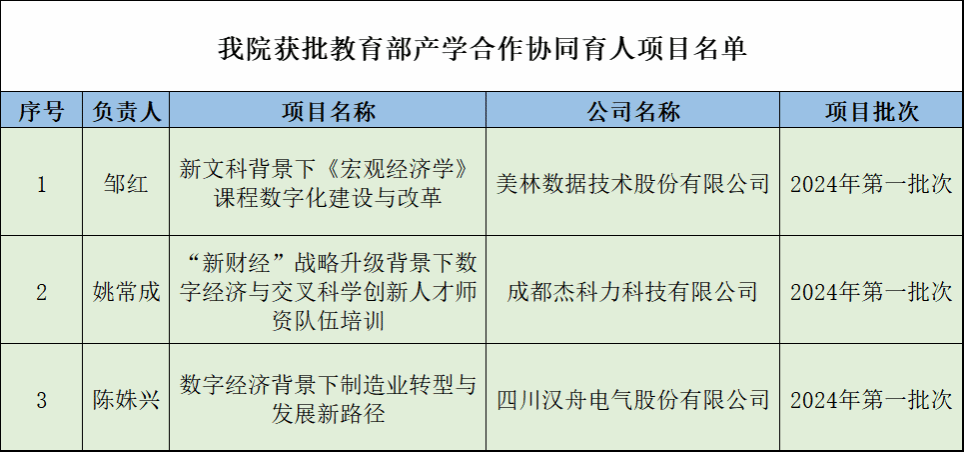近日,教育部高教司下发《教育部高等教育司关于公布2024年第一批产学合作协同育人项目立项名单的通知》,开云手机web版登录入口邹红教授申报的《新文科背景下<宏观经济学>课程数字化建设与改革》、姚常成副教授申报的《“新财经”战略升级背景下数字经济与交叉科学创新人才师资队伍培训》、陈姝兴副教授申报的《数字经济背景下制造业转型与发展新路径》三个项目均入选教育部产学合作协同育人项目2024年第一批立项项目。