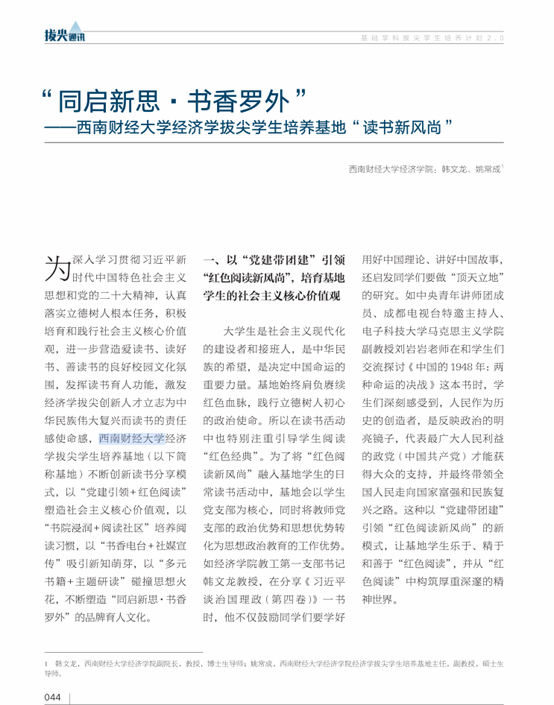 开云手机web版登录入口韩文龙教授和姚常成副教授撰写的《“同启新思·书香罗外”——西南财经大学经济学拔尖学生培养基地“读书新风尚”》在教育部拔尖计划2.0内刊《拔尖通讯》2024年第14期“优秀案例”栏目刊发。